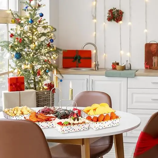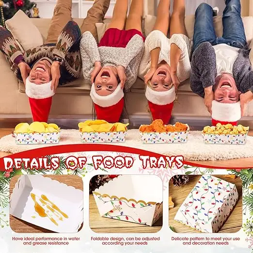 Food Trays Plaid Lights Nutcracker Disposable Christmas Paper Boat Nachos Hot Dog Party Supplies (Bright, Holiday Lights)